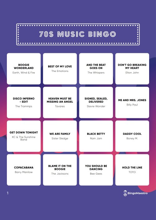 With this music bingo, you will take a trip down memory lane to the 70s. Revisit the classic hits of the decade with friends, family, or colleagues while playing a fun musical bingo. Get ready to dance and sing along to some of the biggest hits of the 70s, such as "Staying Alive" and "Boogie Wonderland". Are you ready to dance?