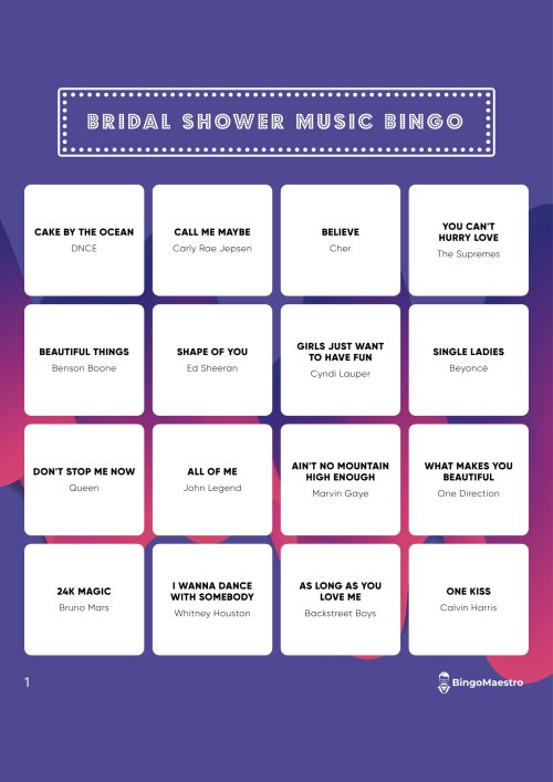 Make the bride’s day unforgettable! Bridal Shower Music Bingo is packed with guilty pleasures, 90’s throwbacks, and sing-alongs everyone knows. From Spice Girls to chart-toppers, expect nonstop laughs, dancing, and big “BINGO!” moments. Easy to play, impossible to forget.