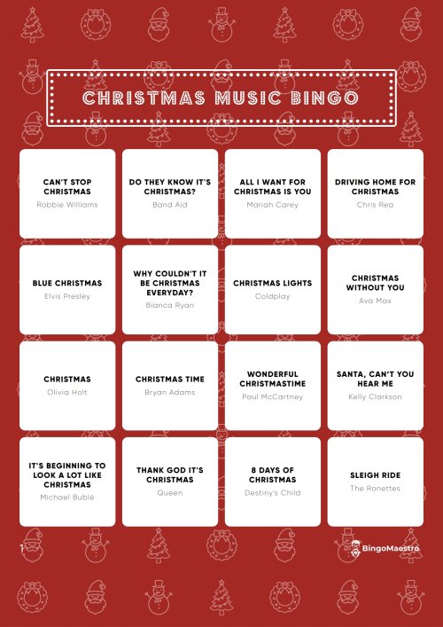 Do you know all the Christmas songs? Test your knowledge in this fun Christmas music bingo. Sing along to your favorite Christmas hits and get into the holiday spirit. Do you know all the song? Who knows, you might have bingo!