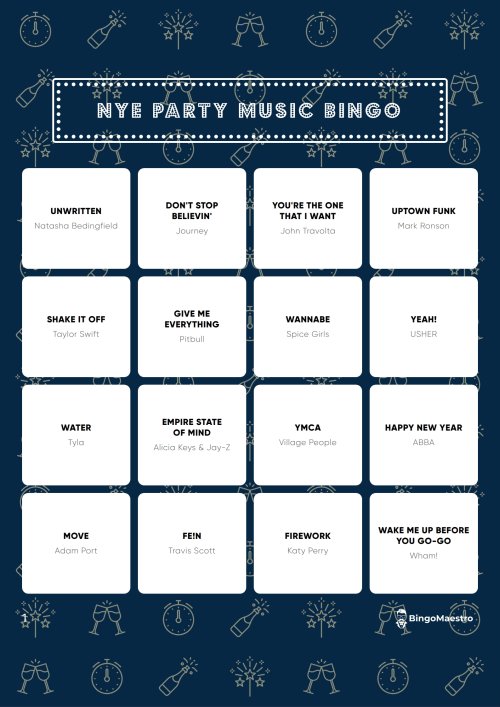 Ready to kick off the new year in style? Our NYE Party Bingo has got you covered! Get ready for the biggest party tracks, the best sing-alongs, and nostalgic guilty pleasures, all packed into this musical bingo extravaganza! Let the celebration begin!