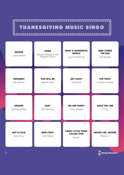 Get ready to bring the whole family together this Thanksgiving with a round of Music Bingo! Packed with timeless classics and today’s feel-good hits, it’s the perfect activity between the turkey and the pumpkin pie. From songs everyone knows by heart to tracks that get the younger crowd singing along, this Thanksgiving Bingo makes sure no one is left out. Easy to set up, fun to play!